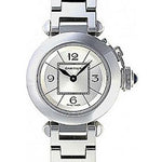 27mm stainless steel case, silver opaline dial with Arabic numerals, quartz Cartier calibre MHH 157 movement, stainless steel bracelet. Water resistant to 30 meters.