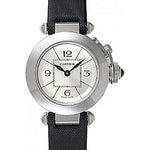 27mm stainless steel case cover with a blue synthetic spinel cabochon, silvered opaline dial with Arabic numerals, quartz Cartier caliber 157 movement, toile de moire strap with adjustable deployant buckle. Water resistant to 30 meters.