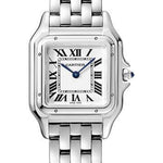 27mm x 37mm steel case, 6mm thick, steel crown with a synthetic blue spinel, sapphire crystal, silvered dial with Roman numerals and blued-steel sword-shaped hands, quartz movement, steel bracelet. Water resistant to 30 meters.