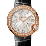30mm 18K pink gold case with brilliant cut diamond at 4 o'clock, 8.40mm thick, bezel set with brilliant-cut diamonds, sapphire crystal, silvered sunray-brushed dial with golden-finish sword-shaped hands, quartz movement, shiny black alligator strap, 18K pink gold ardillon buckle. Water resistant to 30 meteres.