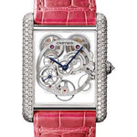 30mm 18K white gold case set with 254 brilliant-cut diamonds, 7.45mm thick, sapphire back, beaded crown set with a brilliant-cut diamond (0.12 carats), sword-shaped hands in blued steel, 18K white gold bezel set with 43 diamonds, sapphire crystal, silver dial, caliber 9616 MC manual-winding movement, approximately 3 days of power reserve, fuchsia alligator skin strap, folding buckle. Water resistant to 3 bar.