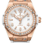 33 mm polished and satin-finished 18k king gold case, polished 18K king gold bezel set with 36 diamonds for 0.76ct, sapphire crystal with anti-reflective treatment, matte white dial, HUB1120 self-winding movement, approximately 40 hours of power reserve, white structured lined rubber strap, 18K king gold and stainless steel deployant buckle. Water resistant to 100m (10 ATM).