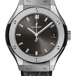 33 mm satin-finished and polished titanium case, satin-finished and polished titanium bezel with 6 h-shaped titanium screws, sapphire crystal with anti-reflective treatment, satin-finished gray sunray dial, HUB2912 quartz movement, approximately 3 to 5 years of power reserve, black rubber and gray alligator leather strap, stainless steel deployant buckle. Water resistant to 50m (5 ATM).