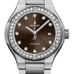 33 mm satin-finished and polished titanium case, polished titanium bezel set with 36 diamonds for 0.8ct with, 6 H-shaped titanium screws, sapphire crystal with anti-reflective treatment, satin-finished brown sunray dial set with 11 diamonds for ~0.2ct, HUB1120 self-winding movement, approximately 40 hours of power reserve, satin-finished and polished titanium bracelet, titanium deployant buckle. Water resistant to 50m (5 ATM).