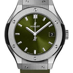 33 mm satin-finished and polished titanium case, satin-finished and polished titanium bezel with 6 h-shaped titanium screws, sapphire crystal with anti-reflective treatment, satin-finished green sunray dial, HUB2912 quartz movement, approximately 3 to 5 years of power reserve, green lined rubber strap, stainless steel deployant buckle. Water resistant to 50m (5 ATM).