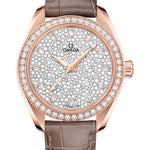 34 mm 18K Sedna gold case, transparent back, diamond-set bezel, domed scratch-resistant sapphire crystal anti-reflective treatment on both sides, radiant dial is fully paved with a snow setting of 498 diamonds, while the indexes at each hour include 12 marquise-cut diamonds, Caliber Omega 8807 self winding movement with a co-axial escapement, chronometer, approximately 55 hours of power reserve, taupe-brown leather strap. Water resistant to 15 bar (150 metres / 500 feet).