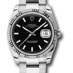 34mm polished stainless steel case, 18K white gold fluted bezel, black dial, index hour markers, and Oyster bracelet with brushed outer links and polished center links.