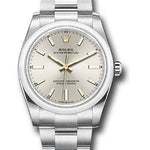 34mm Oystersteel case, screw-down crown with twinlock double waterproofness system, domed bezel, scratch-resistant sapphire crystal, silver dial, index hour markers, Rolex calibre 2232 automatic movement with center hour, minute and seconds hands, and stop-seconds for precise time setting, approximately 55 hours of power reserve, Oyster bracelet with flat three-piece links, folding Oysterclasp buckle with Easylink 5mm comfort extension link. Waterproof to 100 meters.