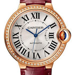 36mm 18K pink gold case, 12.10mm thick, fluted crown set with a sapphire cabochon, bezel set with brilliant-cut diamonds, sapphire crystal, silvered sunray-brushed dial with blued-steel sword-shaped hands, automatic movement, burgundy alligator strap, 18K pink gold ardillon buckle. Water resistant to 30 meteres.