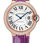 36 mm 18K rose gold case set with 123 brilliant-cut diamonds, 12.1 mm thick, fluted crown decorated with a cabochon sapphire, sapphire crystal, lacquered opaline dial, automatic movement, purple alligator-skin strap, interchangeable 18K rose gold folding buckle. Water resistant to 3 bar (approx 30 metres).