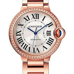 36 mm 18K rose gold case set with 54 brilliant-cut diamonds, 12.1 mm thick, fluted crown decorated with a cabochon sapphire, sapphire crystal, silvered sunray-brushed dial, automatic movement, interchangeable 18K rose gold bracelet. Water resistant to 3 bar (approx 30 metres).