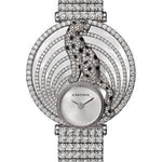 36mm 18K white gold case with 621 brilliant-cut diamonds totalling 4.10 carats and lacquer panther spots,, sapphire crystal, silvered dial with sunray effect and rhodium-finish steel sword-shaped hands, quartz movement, 18K white gold paved bracelet with 372 brilliant-cut diamonds totalling 10.43 carats. Water resistant to 30 meters.