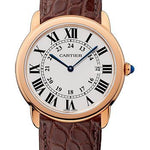 36mm 18K pink gold case, 6.51mm thick, sapphire back, beaded crown set with a synthetic cabochon-shaped spinel, 18K pink gold bezel, sapphire crystal, silver dial with roman and arabic numerals, quartz movement with sword-shaped hands in blued steel, brown alligator skin strap with round-scale, ardillon buckle. Water resistant to 3 bar.