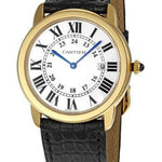 Large size (36mm) 18K yellow gold case, stainless steel back, silvered opaline dial with Roman and Arabic numerals, quartz Cartier calibre 115A movement, alligator strap with 18K gold ardillon buckle. Water resistant to 30 meters.