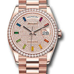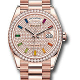 36mm 18K Everose gold case, screw-down back, screw-down crown with twinlock double waterproofness system, bezel set with 52 diamonds, scratch-resistant sapphire crystal with cyclops lens over the date, diamond-paved dial, rainbow-colored sapphire hour markers, Rolex calibre 3255 perpetual self-winding movement with centre hour, minute and seconds hands, instantaneous day and date in apertures, unrestricted rapid-setting, and stop-seconds for precise time setting, approximately 70 hours of power reserve, 18K Everose gold President bracelet with semi-circular three-piece links, concealed folding Crownclasp buckle. Waterproof to 100 meters. Baselworld 2019 release.