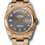 36mm 18K pink gold case, domed bezel, dark mother of pearl dial, diamond hour markers, and Oyster bracelet.