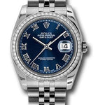 36mm stainless steel case, 18K white gold bezel set with 52 brilliant-cut diamonds, blue dial, Roman numerals, and stainless steel Jubilee bracelet.