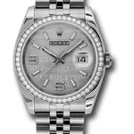 36mm stainless steel case, 18K white gold bezel set with 52 brilliant-cut diamonds, silver wave dial, diamond set 6 and 9 Arabic numerals, and stainless steel Jubilee bracelet.