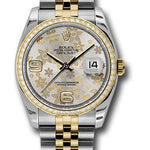 36mm stainless steel case, 18K yellow gold bezel set with 52 brilliant-cut diamonds, silver floral dial, Arabic numerals, and stainless steel and 18K yellow Jubilee bracelet.