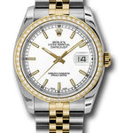 36mm stainless steel case, 18K yellow gold bezel set with 52 brilliant-cut diamonds, white dial, index hour markers, and stainless steel and 18K yellow Jubilee bracelet.
