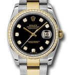 36mm stainless steel case, 18K yellow gold bezel set with 52 brilliant-cut diamonds, black dial, diamond hour markers, and stainless steel and 18K yellow Oyster bracelet.