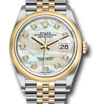 36mm yellow Rolesor case with Oystersteel monobloc middle case, screw-down steel back, screw-down 18K yellow crown, 18K yellow domed bezel, white mother-of-pearl dial, 10 diamond hour markers, Rolex calibre 3235 self-winding movement with date at 3 o'clock, approximately 70 hours of power reserve, yellow Rolesor Jubilee bracelet with five-piece links, folding Oysterclasp buckle with Easylink 5mm comfort extension link. Waterproof to 100 meters. Redesigned for Baselworld 2018 with updated case sides, lugs, and calibre 3235 movement.