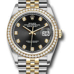 36mm yellow Rolesor case with Oystersteel monobloc middle case, screw-down steel back, screw-down 18K yellow crown, 18K yellow diamond bezel, black dial, 10 diamond hour markers, Rolex calibre 3235 self-winding movement with date at 3 o'clock, approximately 70 hours of power reserve, yellow Rolesor Jubilee bracelet with five-piece links, folding Oysterclasp buckle with Easylink 5mm comfort extension link. Waterproof to 100 meters. Redesigned for Baselworld 2018 with updated case sides, lugs, and calibre 3235 movement.