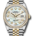 36mm yellow Rolesor case with Oystersteel monobloc middle case, screw-down steel back, screw-down 18K yellow crown, 18K yellow diamond bezel, white mother-of-pearl dial, 10 diamond hour markers, Rolex calibre 3235 self-winding movement with date at 3 o'clock, approximately 70 hours of power reserve, yellow Rolesor Jubilee bracelet with five-piece links, folding Oysterclasp buckle with Easylink 5mm comfort extension link. Waterproof to 100 meters. Redesigned for Baselworld 2018 with updated case sides, lugs, and calibre 3235 movement.