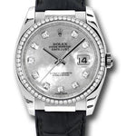 36mm 18K white gold case, bezel set with 60 diamonds, mother of pearl dial, diamond hour markers, and leather strap with 18K white gold deployable clasp.