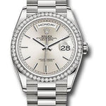 36mm 18K white gold case, screw-down back, screw-down crown with twinlock double waterproofness system, bezel set with 52 diamonds, scratch-resistant sapphire crystal with cyclops lens over the date, silver dial, index hour markers, Rolex calibre 3255 perpetual self-winding movement with centre hour, minute and seconds hands, instantaneous day and date in apertures, unrestricted rapid-setting, and stop-seconds for precise time setting, approximately 70 hours of power reserve, 18K white gold President bracelet with semi-circular three-piece links, concealed folding Crownclasp buckle. Waterproof to 100 meters. Baselworld 2019 release.