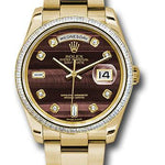 36mm 18K yellow gold case, bezel set with 60 baguette diamonds, bulls eye dial, 8 round and 2 baguette diamond hour markers, and Oyster bracelet.