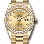 36mm 18K yellow gold case, screw-down back, screw-down crown with twinlock double waterproofness system, bezel set with 52 diamonds, scratch-resistant sapphire crystal with cyclops lens over the date, champagne dial, diamond hour markers, Rolex calibre 3255 perpetual self-winding movement with centre hour, minute and seconds hands, instantaneous day and date in apertures, unrestricted rapid-setting, and stop-seconds for precise time setting, approximately 70 hours of power reserve, 18K yellow gold President bracelet with semi-circular three-piece links, concealed folding Crownclasp buckle. Waterproof to 100 meters. Baselworld 2019 release.
