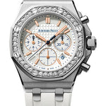 37 mm stainless steel case, 12.35 mm thick, screw-locked crown, diamond-set bezel, silver-toned dial with Lady Tapisserie pattern, silver-toned counters, pink gold applied hour-markers and Royal Oak hands with luminescent coating, Calibre 2385 selfwinding movement with chronograph, hours, minutes, small seconds and date, approximately 40 hours of power reserve, white rubber strap, stainless steel AP folding buckle , comes with additional blue rubber strap. Water resistant to 50 m.