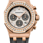 18K pink gold case, 37 mm thick, screw-locked crown, diamond-set bezel with 32 brilliant-cut diamonds (~1.02 carats), glareproofed sapphire crystal, silver-toned dial with Lady Tapisserie pattern, grey ruthenium-toned counters, grey ruthenium-toned external zone, pink gold applied hour-markers and Royal Oak hands with luminescent coating, Calibre 2385 selfwinding movement with chronograph, hours, minutes, small seconds and date, approximately 40 hours of power reserve, grey rubber strap, 18K pink gold AP folding buckle. Water resistant to 50 meters.