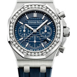 37 mm stainless steel case, 12.4 mm thick, glareproofed sapphire crystal back, screw-locked crown, diamond-set bezel with 32 brilliant-cut diamonds (~1.02 carats), glareproofed sapphire crystal, blue dial with Lady Tapisserie pattern, blue counters, blue external zone, white gold applied hour-markers and Royal Oak hands with luminescent coating, Calibre 2385 selfwinding movement with chronograph, hours, minutes, small seconds and date, approximately 40 hours of power reserve, blue rubber strap, stainless steel AP folding buckle. Water resistant to 50 meters.