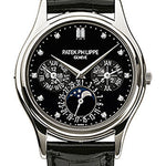 37.2 mm platinum case, interchangeable full and sapphire-crystal back, ebony-black sunburst dial with diamond hour markers, caliber 240 Q ultra-thin self-winding movement with perpetual calendar (day, date, month, leap year by hands, moon phases, 24-hour dial), approximately 38-48 hours of power reserve, shiny black alligator strap with square scales, fold-over buckle. Water resistant to 30 m.