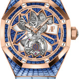 | CASE DETAIL | 18-carat pink gold case set with baguette-cut graded blue sapphires, bezel set with baguette-cut blue sapphires, glareproofed sapphire crystal and caseback, crown set with a translucent sapphire cabochon |