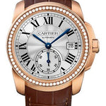 38mm 18K pink gold case, 9 mm thick, faceted crown set with a brilliant-cut diamond, bezel set with brilliant-cut diamonds, sapphire crystal, silvered flinque opaline dial with 11 Roman numerals and blued-steel sword-shaped hands, caliber 1904 MC self-winding movement with calendar aperture at 3 o'clock and small seconds counter at 6 o'clock, approximately 48 hours of power reserve, dark brown alligator skin strap, double adjustable folding 18K pink gold buckle. Water resistant to 30 meters.