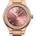 38 mm satin and polished 18K King gold case, polished 18K King gold bezel polished 18k king gold set with 36 diamonds (~1.20.cts) and 6 H-shaped titanium screws, sapphire crystal with anti-reflective treatment, satin-finished pink sunray dial, HUB1110 self-winding movement, approximately 42 hours of power reserve, satin-finished and polished 18k king gold bracelet bracelet, 18K King gold deployant buckle. Water resistant to 50 meters.