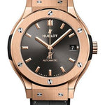 38 mm satin-finished and polished 18k king gold case, satin-finished and polished 18K king gold bezel with 6 h-shaped titanium screws, sapphire crystal with anti-reflective treatment, satin-finished gray sunray dial, HUB1110 self-winding movement, approximately 42 hours of power reserve, black rubber and gray alligator leather strap, 18K king gold deployant buckle. Water resistant to 50m (5 ATM).