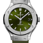 38 mm satin-finished and polished titanium case, satin-finished and polished titanium bezel with 6 h-shaped titanium screws, sapphire crystal with anti-reflective treatment, satin-finished green sunray dial, HUB1110 self-winding movement, approximately 42 hours of power reserve, green lined rubber strap, stainless steel deployant buckle. Water resistant to 50m (5 ATM).