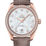 38 mm 18K Sedna gold case, transparent back, domed scratch-resistant sapphire crystal anti-reflective treatment on both sides, white pearled mother-of-pearl dial with a date window at 6 o’clock and 11 diamond indexes in 18K Sedna™ gold holders, Caliber Omega 8801 self winding movement with co-axial escapement, chronometer, date, approximately 55 hours of power reserve, taupe-brown leather strap. Water resistant to 15 bar (150 metres / 500 feet).