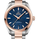 38 mm stainless steel and 18K Sedna gold case, transparent back, domed scratch-resistant sapphire crystal anti-reflective treatment on both sides, waved blue dial features a date window at 6 o’clock, while 18K Sedna™ gold is used for the hands as well as the indexes, which are shaped like sailboat hulls, Caliber Omega 8800 self winding movement with co-axial escapement, chronometer, date, approximately 55 hours of power reserve, stainless steel and Sedna gold bracelet. Water resistant to 15 bar (150 metres / 500 feet).