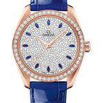 38 mm sedna gold case with anti-magnetic protection, transparent back, diamond-set bezel, domed scratch-resistant sapphire crystal with anti-reflective treatment on both sides, white dial is fully paved with a snow setting of 696 diamonds and sapphire hour markers, Calibre Omega 8807 self-winding co-axial master chronometer movement, approximately 55 hours of power reserve, glossy blue leather strap. Water resistant to 150 metres (500 feet).