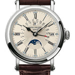 38mm 18K white gold case, hinged dust covered sapphire crystal back, hand-guilloched dial, self winding perpetual calendar caliber 315 S QR movement with day, retrograde date, month, moon phase, leap year indications, and sweep second hand, approximately 48 hour of power reserve, leather strap with fold-over buckle. Water resistant to 30 meters.