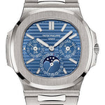 40 mm 18K white gold case, 8.42 mm thick, blue sunburst dial with gold applied luminescent hour markers, caliber 240 Q self-winding movement with perpetual calendar, moon phases, day, date, month, leap year and 24-hour indication by hands, approximately 38-48 hours of power reserve, 18K white gold bracelet, fold-over buckle. Water resistant to 60 m. Patek PhilippeÕs thinnest perpetual calendar.