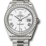 40mm 18K white gold case, screw-down back with Rolex fluting, screw-down crown with twinlock double waterproofness system, bezel set with 48 diamonds, scratch-resistant double anti-reflective sapphire crystal with cyclops lens over the date, white dial, bevelled deconstructed Roman numerals, Rolex calibre 3255 automatic movement with centre hour, minute and seconds hands, instantaneous day and date in apertures, unrestricted rapid-setting, and stop-seconds for precise time setting, approximately 70 hours of power reserve, President bracelet with three-piece solid links comprised of a polished center link, satin-finished outer links, and ceramic inserts, concealed folding Crownclasp buckle. Waterproof to 100 meters.