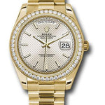 40mm 18K yellow gold case, screw-down back with Rolex fluting, screw-down crown with twinlock double waterproofness system, bezel set with 48 diamonds, scratch-resistant double anti-reflective sapphire crystal with cyclops lens over the date, silver diagonal motif dial, index hour markers with Chromalight, Rolex calibre 3255 automatic movement with centre hour, minute and seconds hands, instantaneous day and date in apertures, unrestricted rapid-setting, and stop-seconds for precise time setting, approximately 70 hours of power reserve, President bracelet with three-piece solid links comprised of a polished center link, satin-finished outer links, and ceramic inserts, concealed folding Crownclasp buckle. Waterproof to 100 meters.