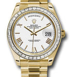 40mm 18K yellow gold case, screw-down back with Rolex fluting, screw-down crown with twinlock double waterproofness system, bezel set with 50 baguette-cut diamonds, scratch-resistant double anti-reflective sapphire crystal with cyclops lens over the date, white dial, bevelled deconstructed Roman numerals, Rolex calibre 3255 automatic movement with centre hour, minute and seconds hands, instantaneous day and date in apertures, unrestricted rapid-setting, and stop-seconds for precise time setting, approximately 70 hours of power reserve, President bracelet with three-piece solid links comprised of a polished center link, satin-finished outer links, and ceramic inserts, concealed folding Crownclasp buckle. Waterproof to 100 meters.