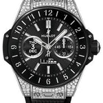 42 mm satin-finished and polished titanium case set with 108 diamonds for 1.19 cts, sapphire crystal with anti-reflective treatment, digital hublot dial, Qualcomm® movement, approximately around 1 day of power reserve, black structured lined rubber strap, titanium deployant buckle. Water resistant to 30m (3 ATM).